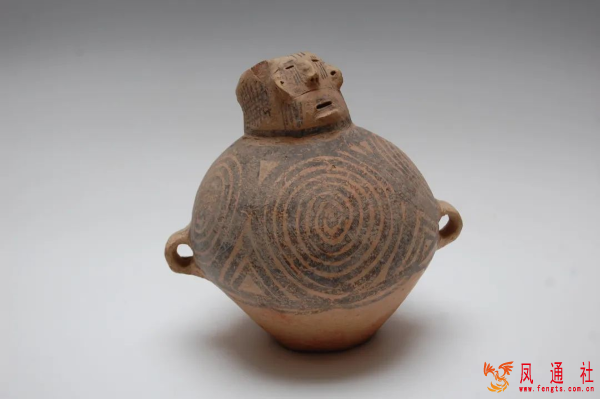 此彩陶颈部饰一人面像,人的眼下部有道平行的线纹,壶腹部有5个圆圈。整个壶的鲜明特征体现着原始社会纹面习俗的装饰。原始社会不但在陶器上模仿人体形态,而且把这种人体形态的器物当作人体一样采取纹身、纹面的装饰,人头像彩陶壶正是体现了这一特点,其装饰反映着当时人们的思想感情、观念和思维能力。人头像彩陶壶的装饰是墓葬中死者的容貌还是死者生前所用巫术礼器,至今不得而知。现藏于中国国家博物馆。