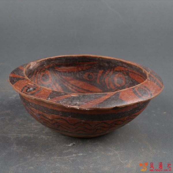 陶盆通体以黑彩绘制纹饰,通过地纹留白形成高度抽象化的变形鱼纹。内底中心饰圆点纹与三层同心圆纹,同心圆外有八条变体的鱼游动在水波中,纹饰的装饰意味已很强烈。