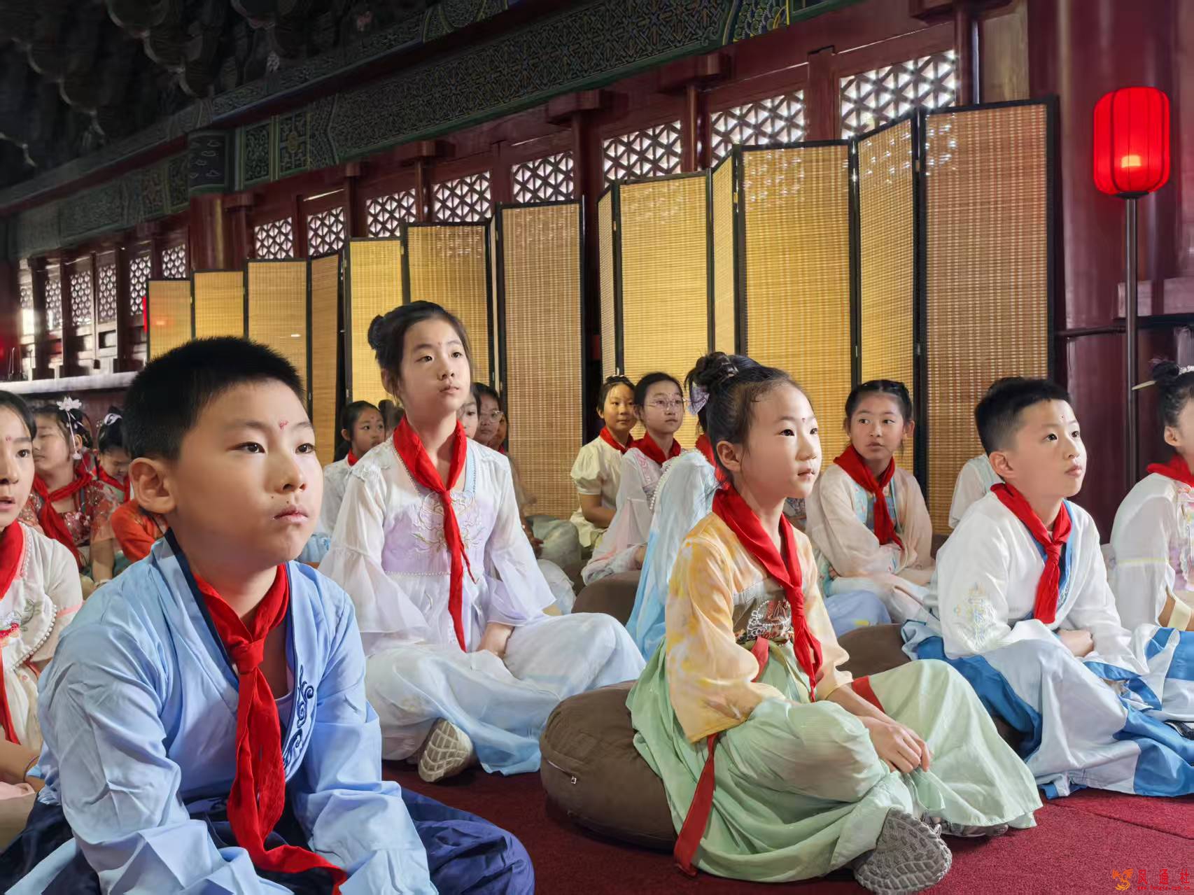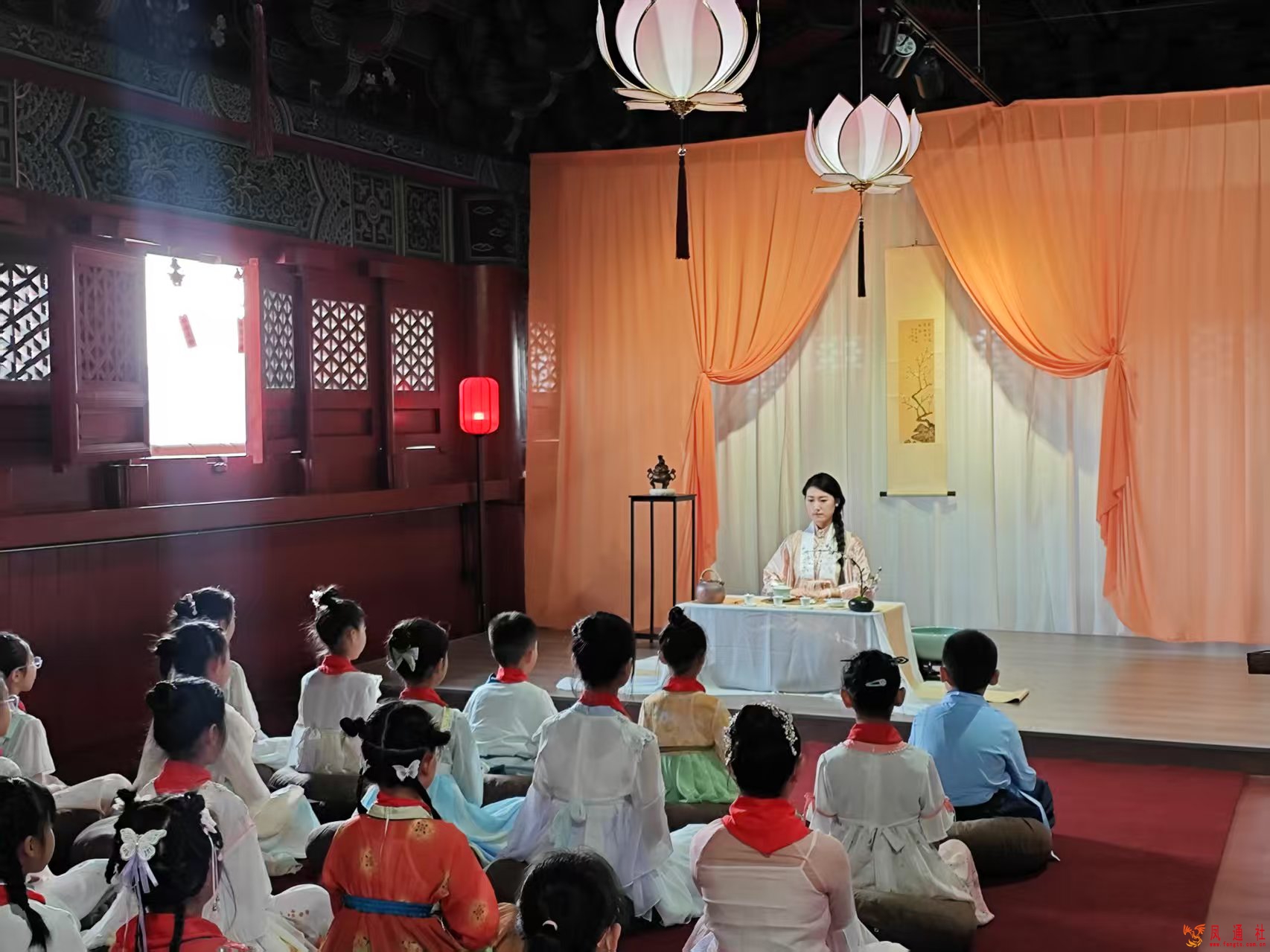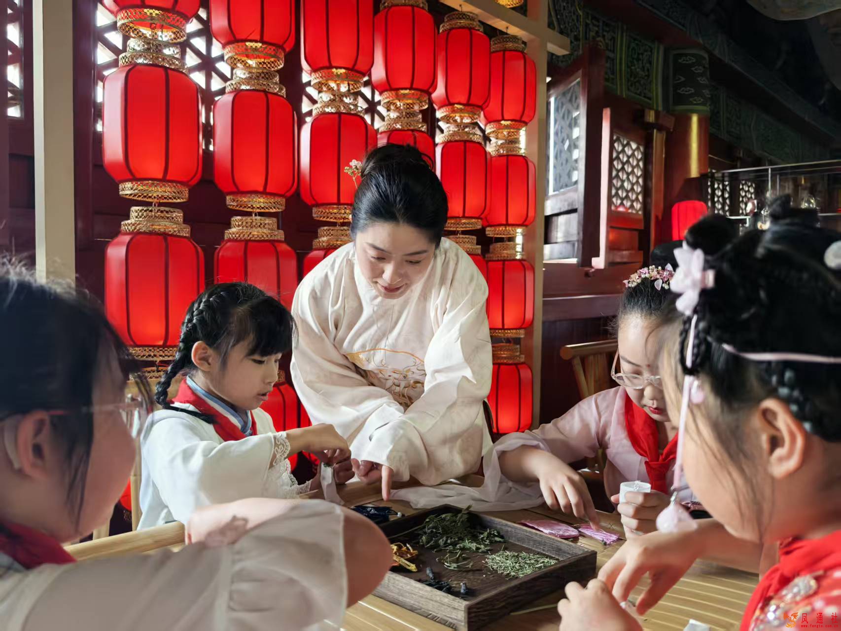 活动在一场悠然雅致的茶艺表演中拉开了序幕。主持人通过故事讲解、习俗演示等方式为同学们讲解历史文物与端午民俗文化,每个知识点都如同一把钥匙,开启了大家对端午文化的认知大门。“端午节有哪些习俗”的问题刚出,同学们便踊跃举手。一位小朋友声音洪亮地回答:“吃粽子、赛龙舟、戴香囊、挂艾草!”“回答正确!”现场欢声笑语不断。随后,社教老师手持毛笔,蘸取朱砂,在孩子们眉心轻点,开启了祈福环节,也为他们送上驱邪纳吉的美好祝愿。