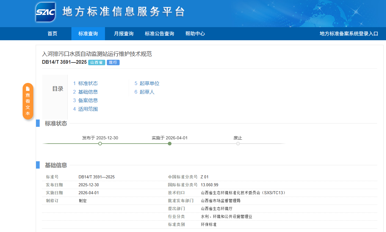 据悉,此次发布的两项标准分别为《入河排污口水质自动监测站建设技术规范》(DB14/T 3590-2025)和《入河排污口水质自动监测站运行维护技术规范》(DB14/T 3591-2025),由省生态环境厅牵头,联合省生态环境监测和应急保障中心(省生态环境科学研究院)等单位,结合山西生态环境保护工作实际编制完成,于2025年12月30日经省市场监督管理局正式发布。