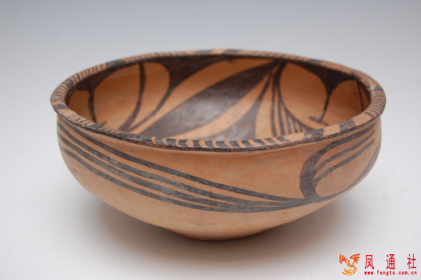 敛口,唇微卷,腹部扁鼓,腹壁向下收缩成小平底。橙黄色细泥陶质,表面打磨光洁,内外均以浓亮的黑彩装饰。口沿上饰有同心圆点纹,中间用网格纹的图案。盆的内壁满施彩,底部中央以圆心定位,画出同心圆圈,亦是同心圆点水波纹的艺术表现形式。器型规整,打磨精细,纹饰繁而不乱,线条流畅飘逸,整个图案在繁复之中透着一种活泼的韵律感。