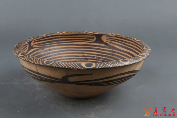 陶盆通体以黑彩绘制纹饰,通过地纹留白形成高度抽象化的变形鱼纹。内底中心饰圆点纹与三层同心圆纹,同心圆外有八条变体的鱼游动在水波中,纹饰的装饰意味已很强烈。