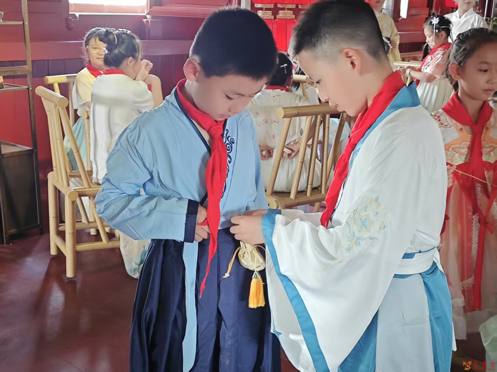 活动在一场悠然雅致的茶艺表演中拉开了序幕。主持人通过故事讲解、习俗演示等方式为同学们讲解历史文物与端午民俗文化,每个知识点都如同一把钥匙,开启了大家对端午文化的认知大门。“端午节有哪些习俗”的问题刚出,同学们便踊跃举手。一位小朋友声音洪亮地回答:“吃粽子、赛龙舟、戴香囊、挂艾草!”“回答正确!”现场欢声笑语不断。随后,社教老师手持毛笔,蘸取朱砂,在孩子们眉心轻点,开启了祈福环节,也为他们送上驱邪纳吉的美好祝愿。